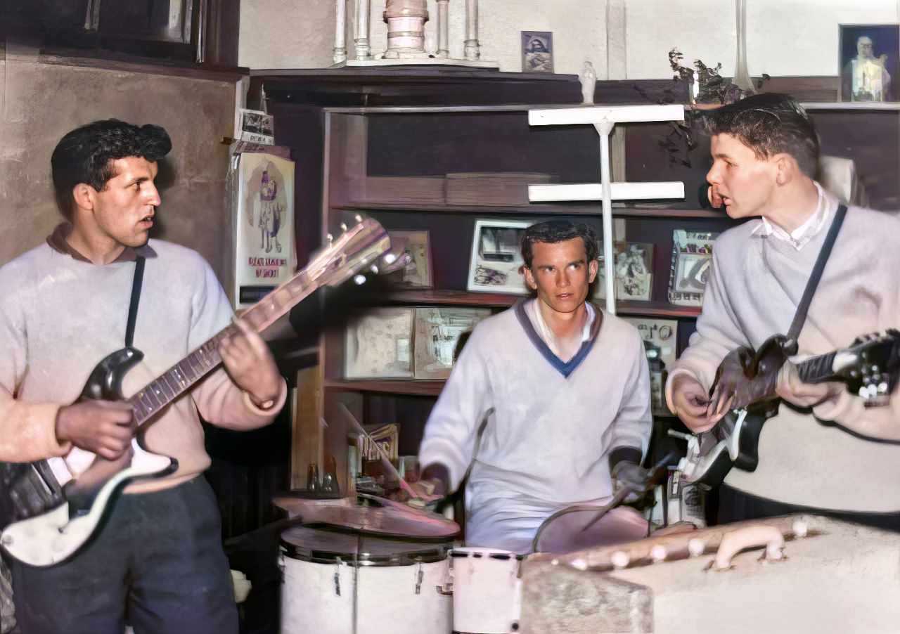 The Apaches was Paul Muggleston's first band, formed back in 1961 - also a great year for the MLC Assurance Company where Paul did 9 months of faithful service, shortly followed by 2 months assembling radios at Roberts Radio, followed by a month with Beaths furniture store delivering TV's and putting up TV antennas on roofs - which he hated! It was during this year, and thanks to money saved from these frustrating ventures that he purchased his first real guitar - a locally produced Commodore instrument, played through another local product - a Concord amplifier with both reverb and tremelo. The only frustration when forming The Apaches with Bob Rush and drummer Peter Alexander - who was at Canterbury University with bassist Jamie (Jim) Norriss, was that the sound of his lead guitar would barely make it to the edge of the stage before plummetting down into oblivion among the feet of the people dancing near the front. The Apaches was a very short lived band and both Paul and Bob Rush avoided remaining forever inconspicuous by joining The Dices - still in 1961. |