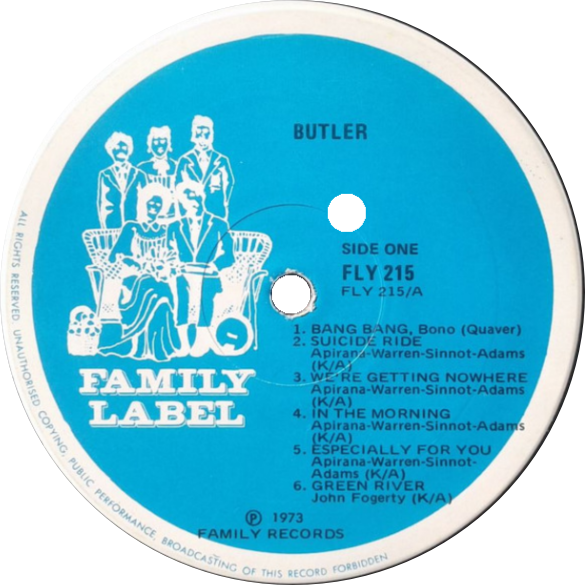 Butler represented one of very few all-Maori rock bands, with members hailing from Rotorua, despite the band actually forming in Christchurch circa 1970. They worked initially at the Open Door, before moving into Trevor Spitz's Aubrey's Nitespot. From the springboard of very strong Christchurch following, the band eyed other South Island centres, and eventually returned to Rotorua in 1971. From there they built a North Island following, and proved popular on the University circuit with their combination of originals and heavier Led Zeppelinish covers. Some television exposure followed with spots on Happen Inn, Popco and Free Ride. This was fairly rare for such an underground group, but even then, they didn't really gain a lot of pulling power. In 1973 they recorded a self-titled album for Pye Records and this was released on the Family label. It yielded only one single which was Green River // Especially For You. |