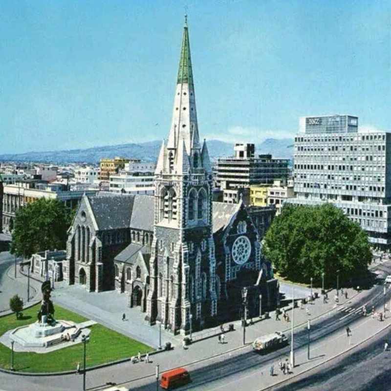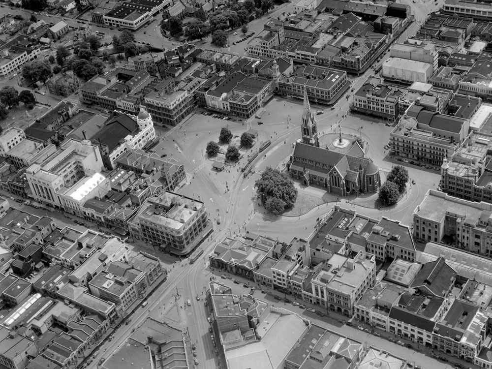 ![]() An 1950s ariel view of Christchurch Cathedral Square towards the north-north-west |