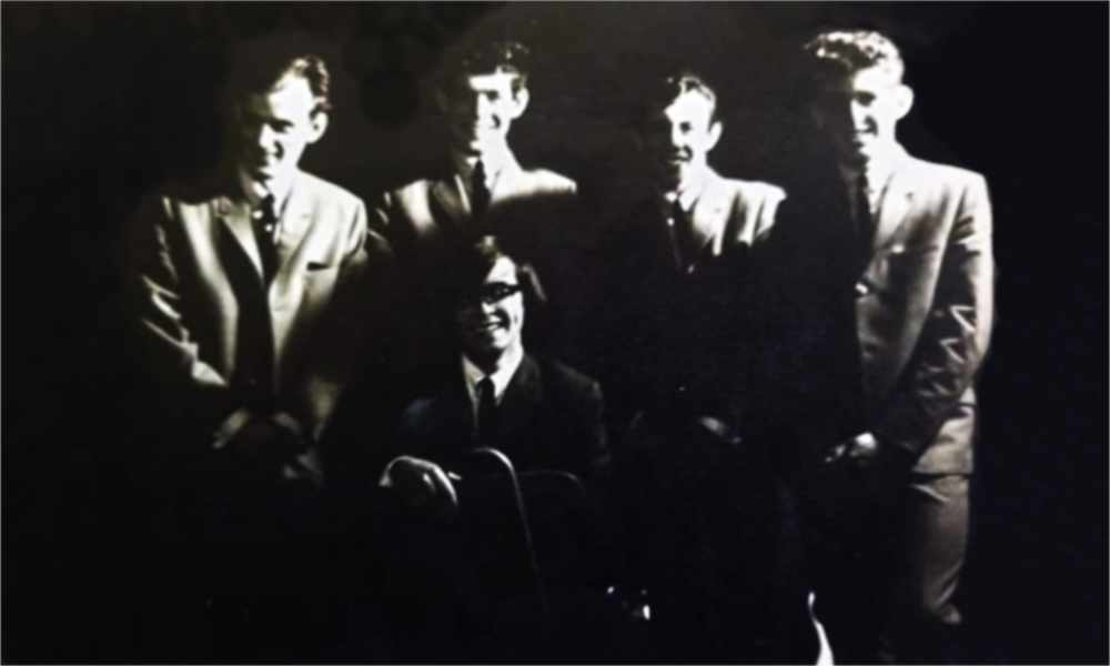 Johnny Robinson (Drums), Trevor Bunting (Bass), Doug Charleston (Rhythm Guitar), Brian Mason (Lead Guitar) and John Hobson (Vocals) at centre bottom