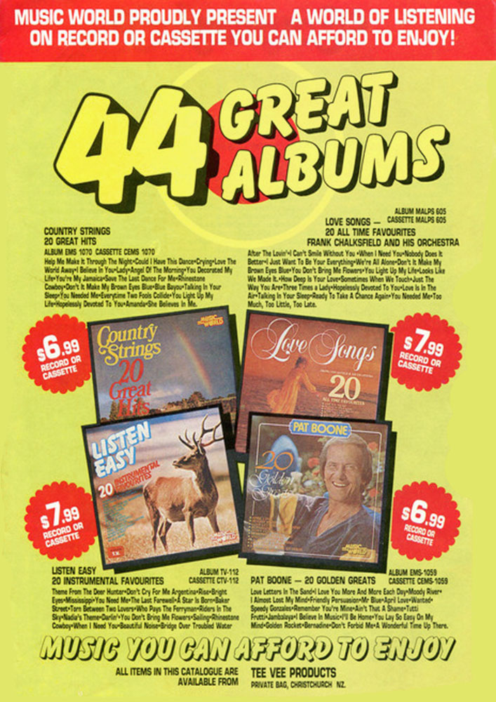 One of Hoghton Hughes' most enduring discoveries was Suzanne Prentice, whose Country Girl was released on Master in 1973 when she was just 14. Country Style Promotions partner Stewart Abernethy, who had earlier encouraged Hughes to sign Max McCauley, gave him the tip on Prentice. Within Music World, Hughes set up other subsidiary labels to cater for different genres. Among them, he released Christian music on Trinity, children's product on Kiddidisc, television-advertised product on Golden Editions, and pop music on Mirage. The idea with the latter was that the records had a better chance at radio without the stigma of being on the budget Music World Label. Sometimes his artists would ask him to manage their careers, but Hughes was too busy putting out records. He believed Danny McGirr could have become a New Zealand Johnny Cash but the singer didn't have the ambition, and he wished he'd recorded more of elderly Ashburton pianist Chloe Gordon, whose potential to move product was huge. Twelve Australian sales reps soon joined Music World's four New Zealand reps when Music World expanded into Australia in 1979. PolyGram's Graham Broughton managed the Australian business until Hughes relocated there in 1985. Before crossing the Tasman he moved Music World to Auckland and installed Ross Donohue to look after the New Zealand operation. Hoghton Hughes and his wife Vanessa first settled in Brisbane before moving to Lennox Head, in the Northern Rivers region of New South Wales. Today, he is still "the ultimate Elvis Presley freak, the world's oldest teenager". His Music World LPs of the 1970s and 1980s are staples in provincial New Zealand second-hand shops and all over online auction sites for upwards of $30, all the while with their $4.99 removable sticker in plain sight. |