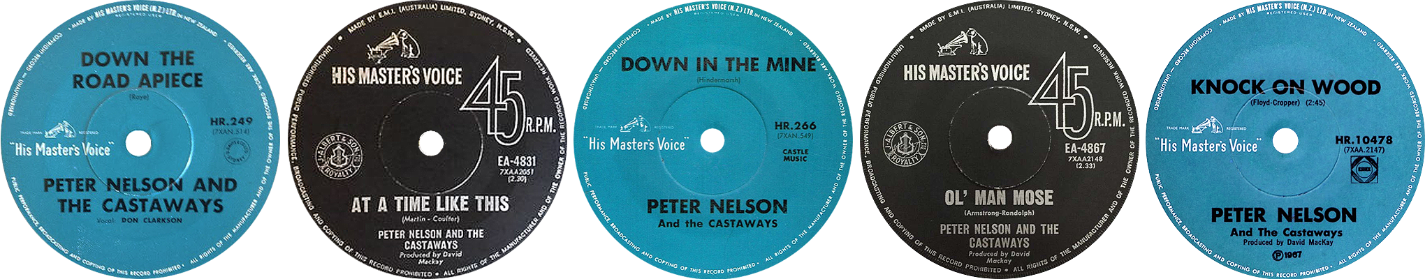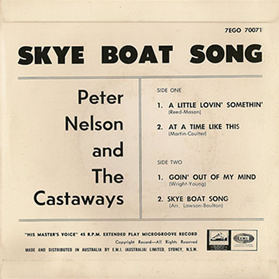In the latter part of 1966, Peter Nelson and The Castaways moved permanently to Sydney from where Peter Nelson left in 1967 to try his luck in the Asian market. The remaining Castaways replaced him with Frankie Stevens on vocals, changed the band's name to simply The Castaways, and continued as a major club band in Australia for some time. There were still two singles to be released as Peter Nelson and the Castaways — Knock On Wood // Old Man Mose and At A Time Like This // A Little Lovin' Somethin' and both saw the light of day in 1967. As the Castaways they released the singles Any Little Bit // Early Morning in 1967 and One More Fool // Baby What I Mean and Angelica // Love Is A Hurtin' Thing for EMI in Australia before returning to New Zealand in 1968. During their later time in Australia, Lenny Ormsby was replaced by Reno Tehei, Doug Petrie by ex-Twilights drummer Laurie Pryor, and Peter Gillette by Lance Dixon. |