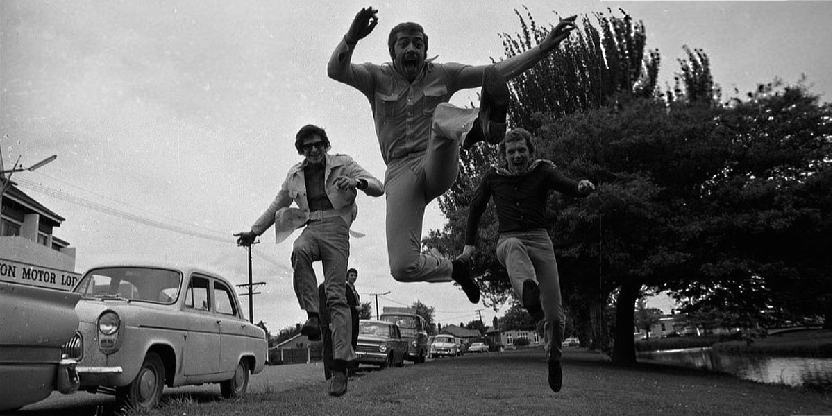 ![]() The Peddlers jumping their way along Oxford Terrace in Christchurch. Roy Phillips, Trevor Morais and Tab Martin |