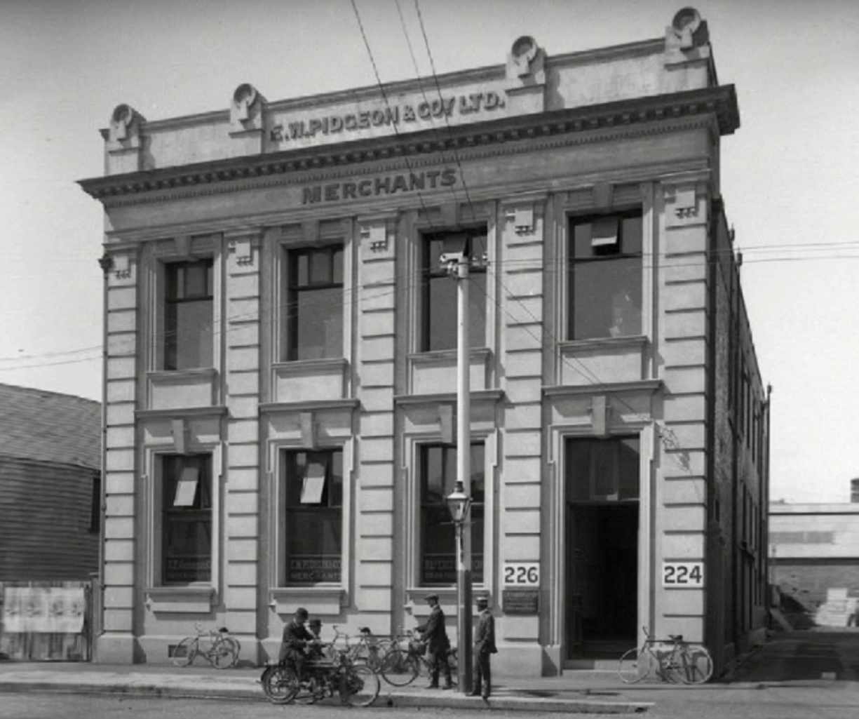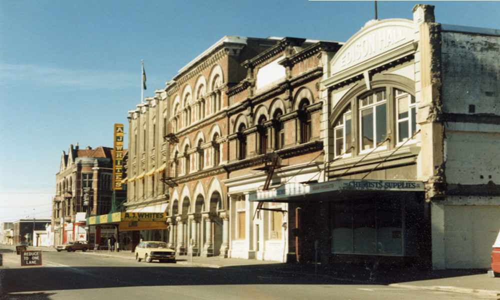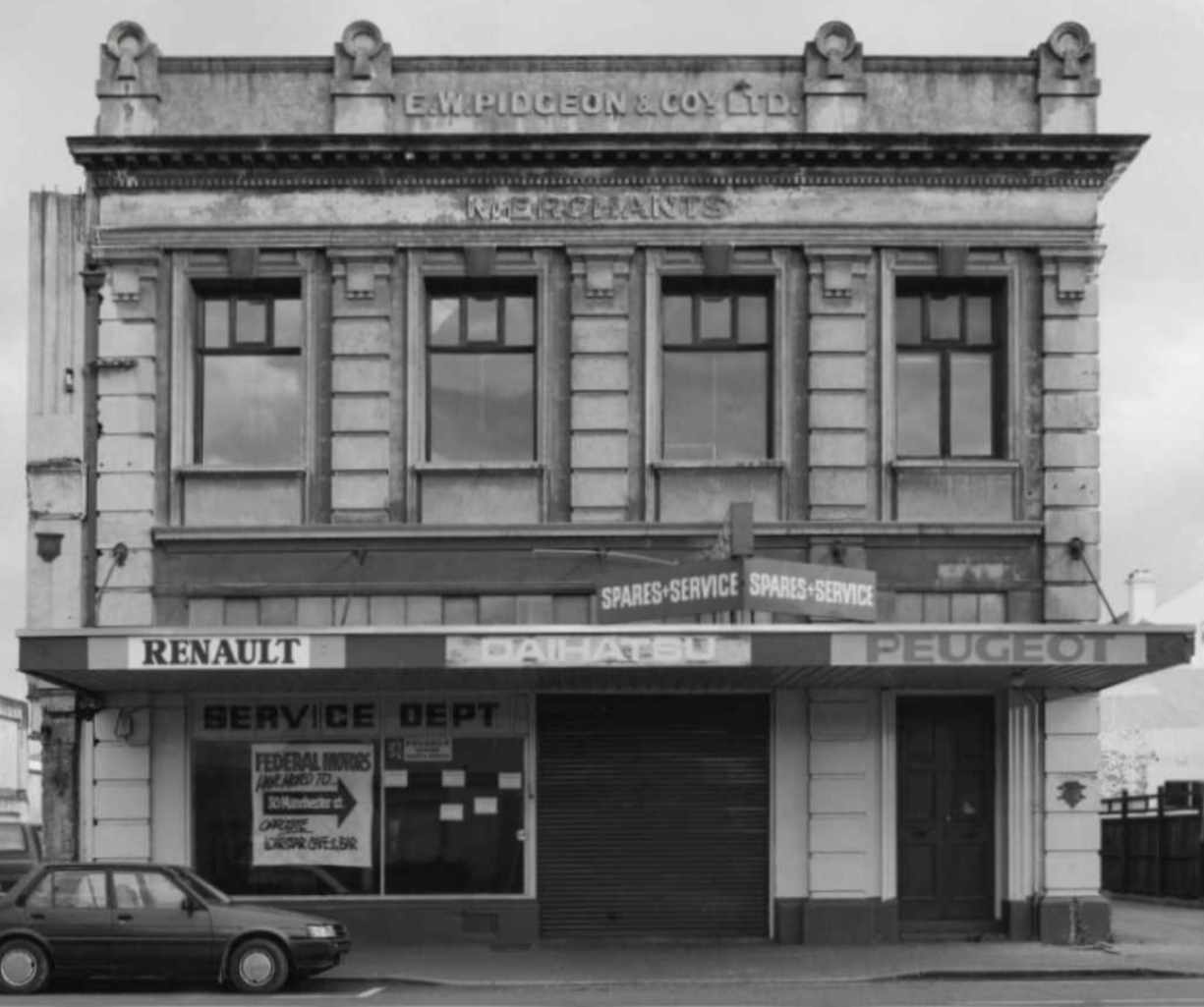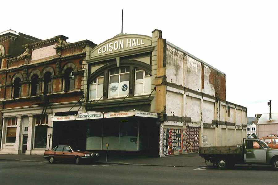 The image above is a view along Tuam Street to the east, and it shows the Edison Hall building clearly (230 Tuam Street), with the remnants of the E.W. Pidgeon and Coy Ltd. building hanging precariously on its right hand edge (the remnants match up well with the corresponding edge of the monochrome image of the E.W. Pidgeon and Coy Ltd. building edge.. Key residents at particular times were Peter Nelson and The Castaways (The Safari Lounge), Les Street and The Alleys (The Scene), and The Detours (The Mecca Nitespot). |