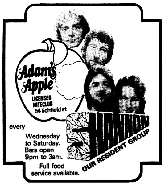 The original, or Mark 1 version of Shannon morphed out of Rock and Roll Spinach with Maurice "Moz" Sammons on lead guitar, Ross Nicol on bass guitar, Kevin Toneycliffe on drums and Neville Claughton on keyboards. The group was at that time resident at The Blenheim Road Motor Inn. Eventually the Mark 2 version of the group would attain residency at Adam's Apple. |