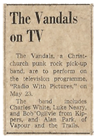 The Vandals were an uneasy alliance of the old and the new. Charles White, guitarist with R&B rockers Maud and The Kippers (The Kippers) wanted in on the hot emerging sound so he tapped local identity, Al Park, to join him. Park brought Tony Peake along to sing, and backed by The Kippers' rhythm section, Luke Neary (Bass) and Bob Ogilvie (Drums), they became known for their fast, funny and danceable punk sound and Peake's distinct look, as seen on the front page of The Press in late 1977 - pointed Beatle boots, tight black jeans and green hair, smoke dangling from the side of his mouth and shades. Fingered in the story as Christchurch's first punk, he'd point instead to Christine and Robin Neate, who were just back from England. Luke Neary's understanding of this is that Tony Peake was approached by TVNZ with Al Park involved in some way, to create a punk band that they could record for Radio with Pictures. They had tried some real Auckland punk bands but they were uncontrollable and just couldn't really play well enough. This included Luke's old girlfriend, Shona Bruce's band The Idle Idols - Shona was the drummer. So, with Tony and Al Park on board, Luke, Bob Ogilvie and Charles White formed a core and thus appeared The Vandals. Luke wanted to call it Throbbing Dead Vicars but was over-ruled. By then Al had put the Mollett Street thing together and The Vandals did some live acts there. That was fun, and at this point, one of the real Christchurch punk bands had a song called Charlie White, do you want a fight - Luke thinks Charles liked the notoriety! |