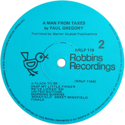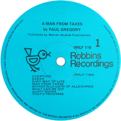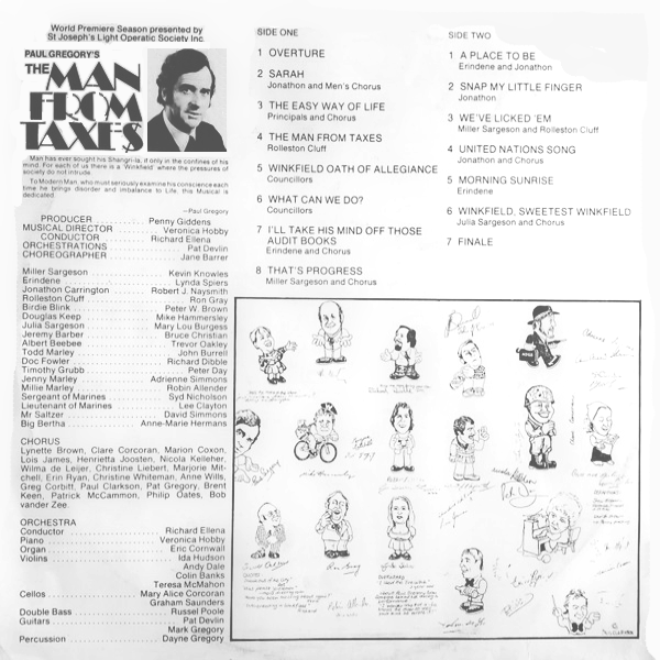 The Man From Taxes was a musical play by Paul Gregory which was released in 1977 featuring an original cast of singers and musicians, and published by Warren Musical Publications. It was presented by the St Joseph's Light Operatic Society under producer Penny Giddens and musical director Veronica Hobby. It was conducted by Richard Ellena. Recordings were made by Robbins Recordings. The LP label incorrectly states the title as "A Man From Taxes" |