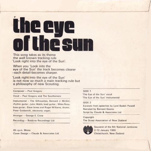 Released in 1969 as a souvenir of the 5th National Scout Jamboree (2nd - 12th January), The Eye of The Sun featured Paul Gregory and The Southerners on vocals, with backing by The Silhouettes — Bernard J. McGirr (Rhythm Guitar), John Webb (Lead guitar), Miles "Milo" Reay (Bass guitar), Dave Innes, Roger Williams (Drums) and Peter Goldsmith (Electronic organ). Recordings were made at Robbins Recordings in Springfield Road, Christchurch. Composed by Paul Gregory and arranged was by George E. Crow. |