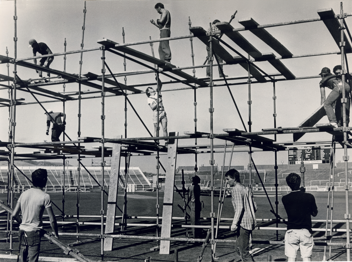 ![]() Placing scaffolding in preparation for the Dire Straits concert at Lancaster Park, March 7th, 1986 |